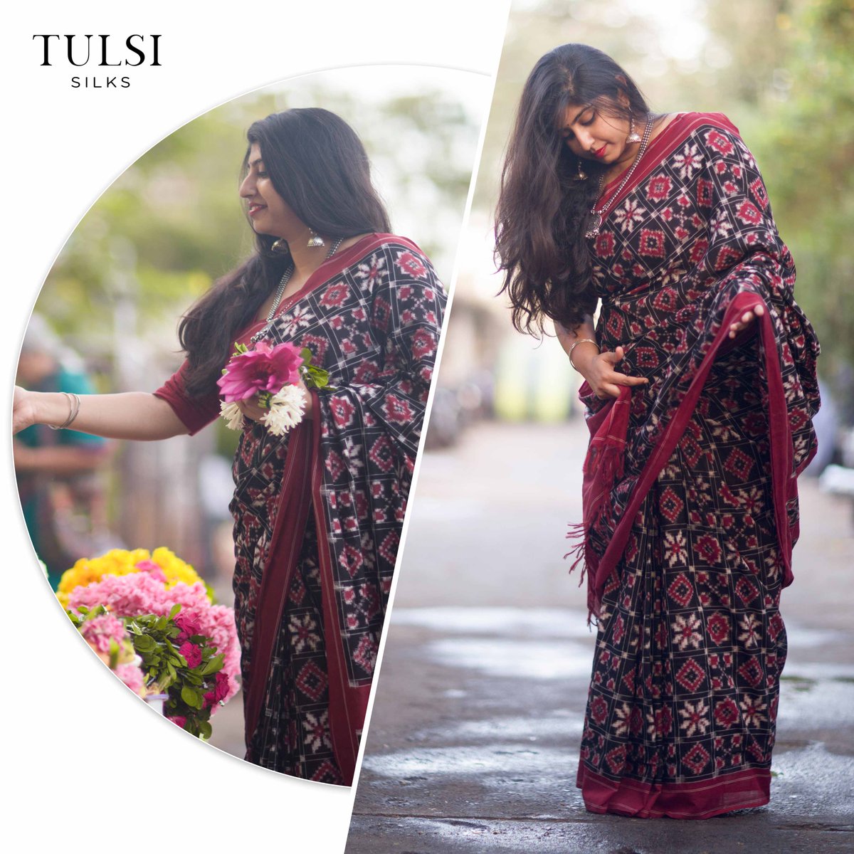 Telia Rumal Saree / Telia Rumal Two Motif Black Silk Saree Saree Jacket Designs Designer Dresses Indian Khadi Saree : Telia rumal is a intricate double ikat weave made using a laborious and time intensive process.