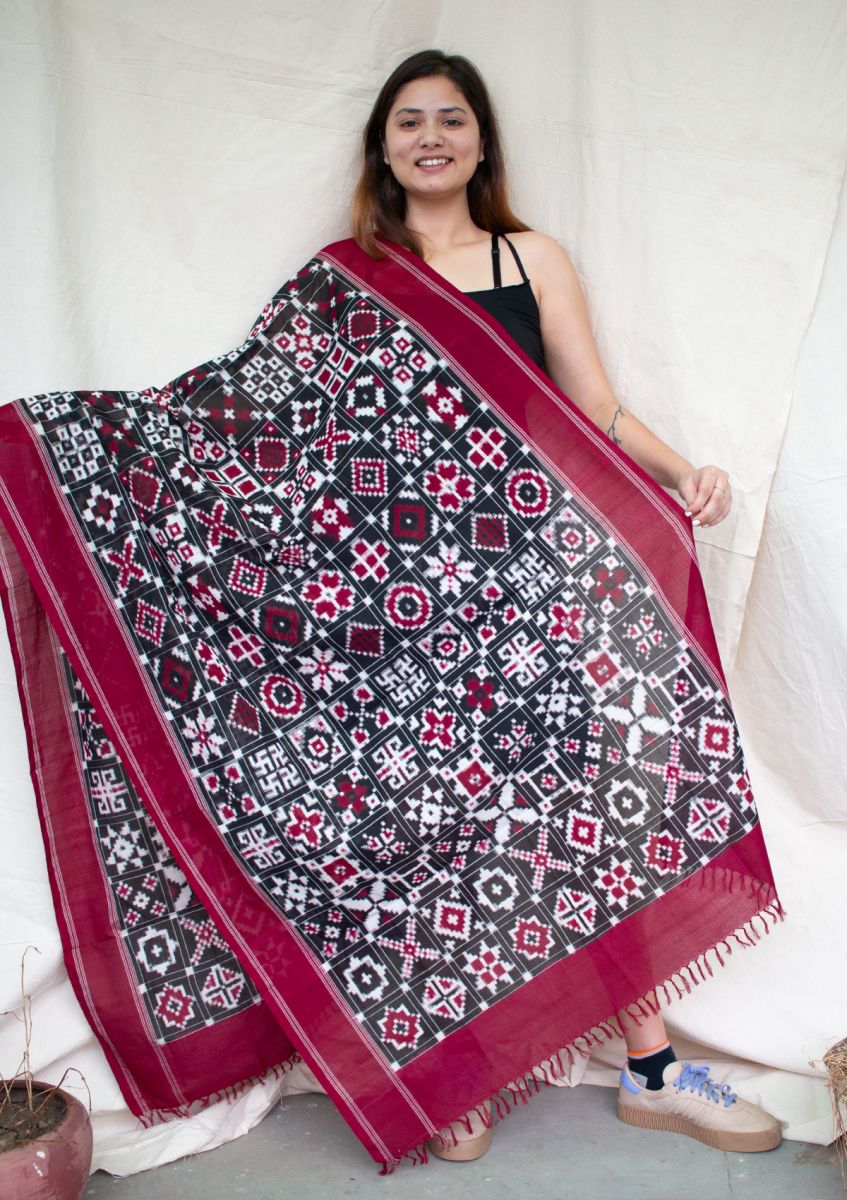 The coveted telia rumal hand woven ikat saree. Red black telia rumal cotton saree. Supporting more than 1500 weavers and artists, we take these beautiful sarees to the world The whole process of telia rumal weaving requires high level of skill, years of experience, and perfect team work. Today, the telia rumal has finally found a new and befitting avatar in the form of sarees ad dupattas.